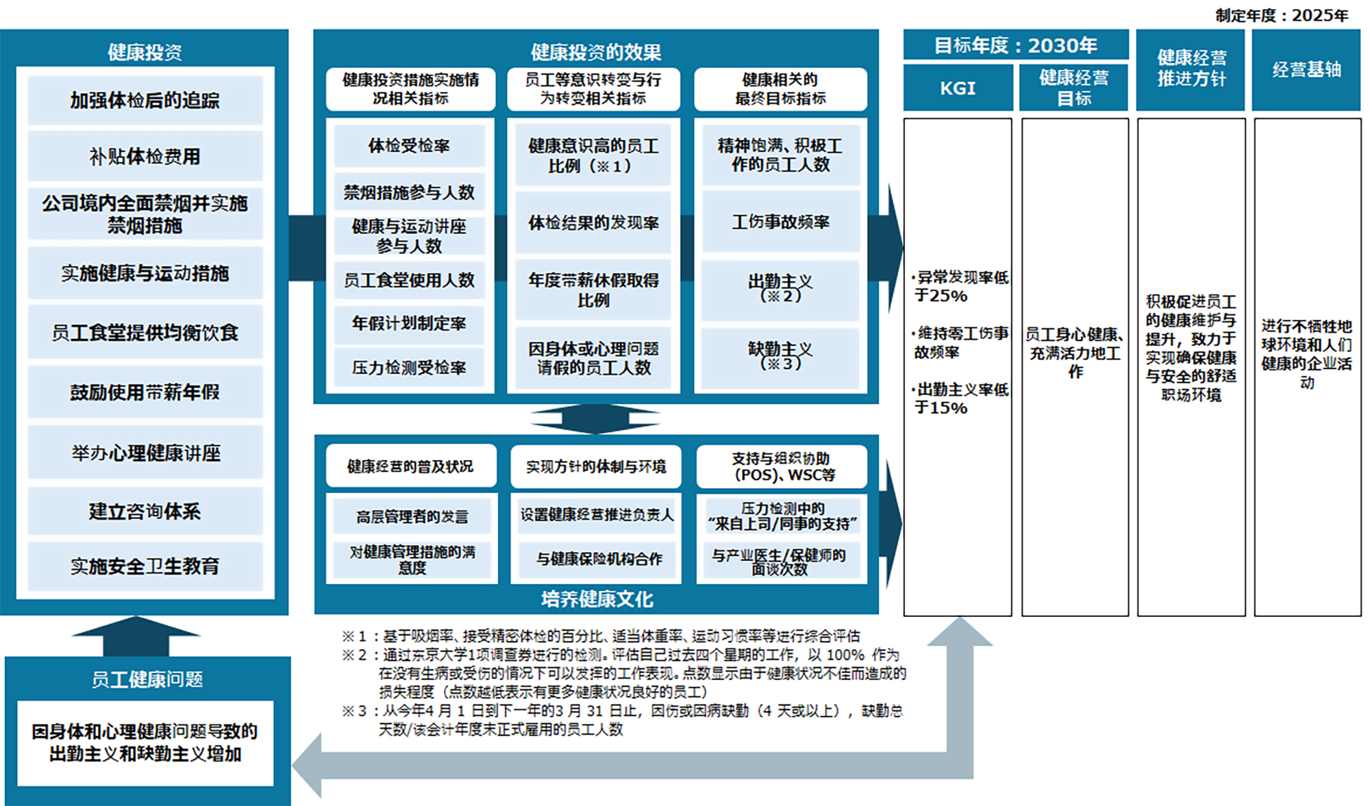 通过保障员工身心健康与营造舒适的工作环境,我们致力于推动不牺牲地球环境和人们健康的企业活动。为此,我们制定了将经营课题与健康课题串联的可视化健康经营战略图,并运用PDCA循环机制提升其实施效果。