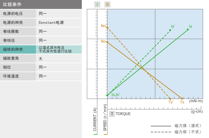 磁铁也有各式各样的种类,在这里,主要是指磁力的变化。 因为由湿式异方性磁铁变更为干式异方性磁铁时,磁力会减弱,造成停动转矩(Ts)下降,无负荷旋转数(N0)增加。